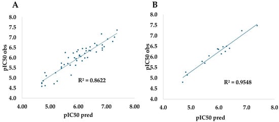 Scatter plot of the observed versus phase-predicted activity (pIC50) through leave-one-out cross-validation (A) and Hold-Out (B).