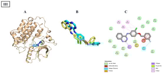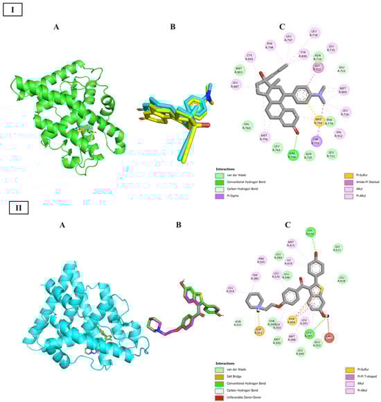 Validation of the redocking protocol for the native receptor-inhibitor complexes: (A) ribbon representation of the target protein, (B) superposition of the crystallographic (yellow) and redocked (cyan) inhibitor conformations, and (C) 2D interaction map of the redocked pose. I: The progesterone-activated transcription factor nuclear receptor with Mifepristone. II: The estrogen-activated transcription factor nuclear receptor with Raloxifene. III: Tyrosine protein kinase receptor erbB-2 with Lapatinib.