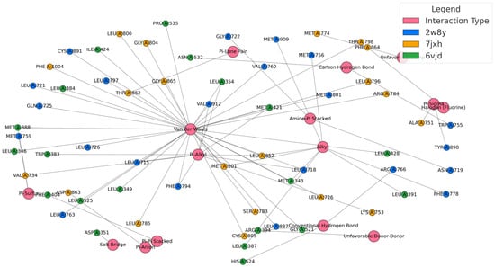 Network of ligand–protein non-covalent interactions in complexes 2W8Y, 7JXH, and 6VJD, classified by contact type and participating residue.