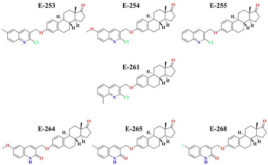 Two-dimensional chemical structures of the seven top-ranked designed steroidal ligands (Estero-253, Estero-254, Estero-255, Estero-261, Estero-264, Estero-265, and Estero-268).