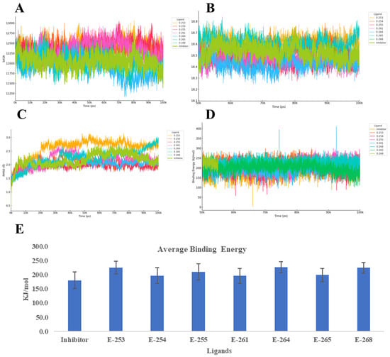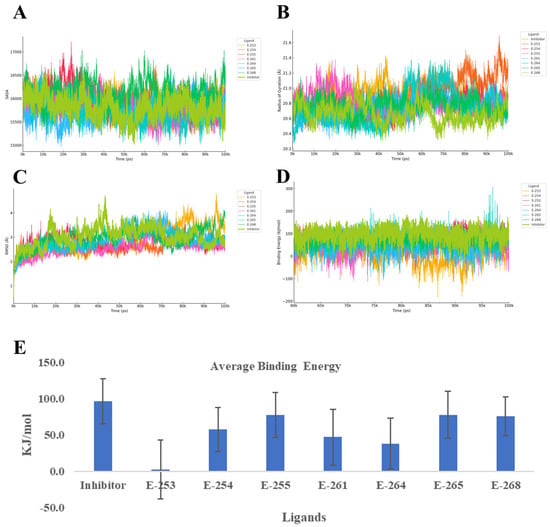 Structural and energetic evolution of the 7JXH complex over 100 ns of molecular dynamics simulations with seven steroid derivatives and a reference inhibitor: panel (A) displays the solvent-accessible surface area (SASA), panel (B) the variation in radius of gyration, panel (C) the backbone RMSD, panel (D) the time courses of binding energy calculated via MMPBSA, and panel (E) the mean ± SD of this energy; together, these curves and bars enable comparison of the conformational stability and relative affinity of E-253, E-254, E-255, E-261, E-264, E-265, E-268, and the inhibitor toward the target protein.