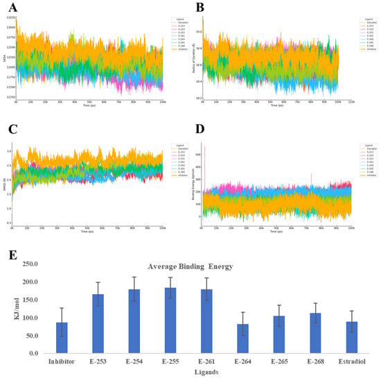 Structural and energetic evolution of the 6VJD complex over 100 ns of molecular dynamics simulations with steroid ligands: panel (A) displays the solvent-accessible surface area (SASA), panel (B) the variation in radius of gyration, panel (C) the backbone RMSD, panel (D) the time courses of binding energy, and panel (E) the mean ± SD of this energy; together, these curves and bars enable comparison of the conformational stability and relative affinity of derivatives E-253, E-254, E-255, E-261, E-264, E-265, E-268, estradiol, and the reference inhibitor toward the target protein.