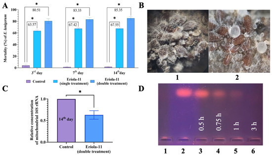 Experiments with oligonucleotide insecticide Eriola-11 on pest E. lanigerum. (A) Olinscide Eriola-11 shows pronounced insecticidal effect after contact application; Eriola-11—single treatment; Eriola-11—double treatment (with a 24 h interval); * is marked when p < 0.05. (B) Olinscide Eriola-11 changes morphology of E. lanigerum: E. lanigerum on an apple tree shoot (5× magnification) before (1) and after (2) treatment with Eriola-11; (C) Olinscide Eriola-11 significantly decreases the concentration of the mitochondrial 16S rRNA; expression of 16S rRNA was analyzed via RT-PCR; control was taken as 1 (100%); * is marked when p < 0.05. (D) Fast biodegradability of olinscide Eriola-11 via tissue homogenate deoxyribonucleases: 1—pure tissue homogenate of insects; 2—start (pure Eriola-11, 4 μg); 3—0.5 h; 4—0.75; 5—1 h; and 6—3 h.