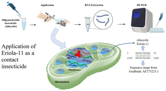 Overall, our study demonstrates that mitochondrial 16S rRNA is a promising target for DNA-based insecticides, and that the oligonucleotide insecticide Eriola-11 shows substantial promise for pest control. Its high efficacy, environmental safety, and specificity highlight its potential as a viable alternative to conventional chemical insecticides. Future research should focus on refining treatment regimens, testing the effectiveness of oligonucleotide insecticides on a broader range of pests, and evaluating their integration into multi-faceted IPM strategies.