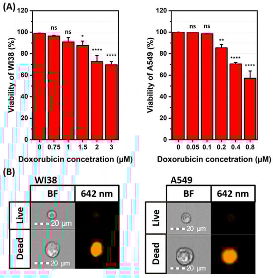 Cytotoxic effect of doxorubicin concentrations used for senescence induction on WI38 and A549. (A) the percentage of viable cells with (B) representative images of live (no fluorescent) and dead (fluorescent, orange) cells for both cell lines. ns—p > 0.05, *–p ≤ 0.05, **–p ≤ 0.01, ****—p ≤ 0.0001.