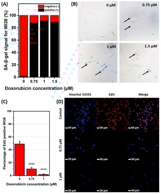 Senescent features of WI38 cell line. (A) percentage of SA-β-gal-positive and negative cells with (B) representative images of stained cells for control and selected concentrations of doxorubicin used for cellular senescence induction. SA-β-gal-positive cells are pointed out with black arrows (Full size images are in Figure S2). (C) percentage of cells actively proliferative and (D) representative images of nuclei of all cells in population stained with Hoechst 33342 (blue); proliferative cells were stained with EdU (red) and both images merged together. ****—p ≤ 0.0001.