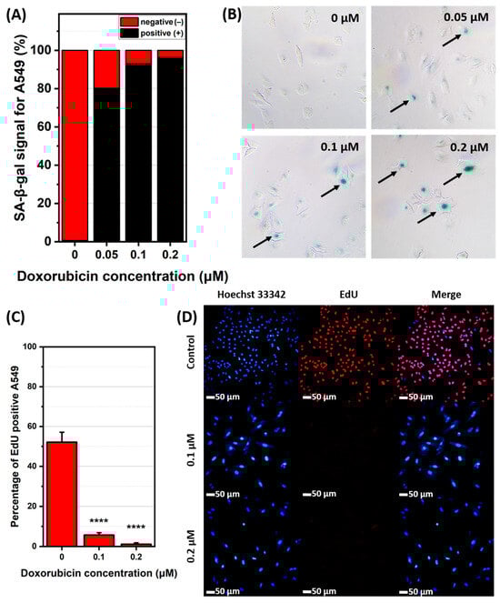 Senescent features of A549 cell line. (A) percentage of SA-β-gal-positive and negative cells with (B) representative images of stained cells for control and selected concentrations of doxorubicin used for cellular senescence induction. SA-β-gal-positive cells are pointed out with black arrows (Full size images are in Figure S3). (C) percentage of cells actively proliferative and (D) representative images of nuclei of all cells in population stained with Hoechst 33342 (blue); proliferative cells were stained with EdU (red) and both images merged together. ****—p ≤ 0.0001.