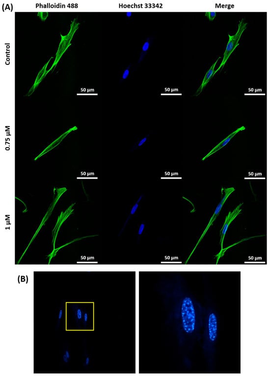 Morphological and nuclear features of senescent WI38 cells. (A) Representative fluorescent images showing the morphology of senescent WI38 cells in comparison to untreated control cells. Actin filaments were stained with phalloidin-488 (green), and cell nuclei were counterstained with Hoechst 33342 (blue). The final panel presents a merged view of both channels. Scale bar: 50 μm. (B) Hoechst 33342 staining reveals the presence of SAHF, represented by lighter dots on the nuclei structure (the image from yellow box is presented on the right to help visualize SAHF).