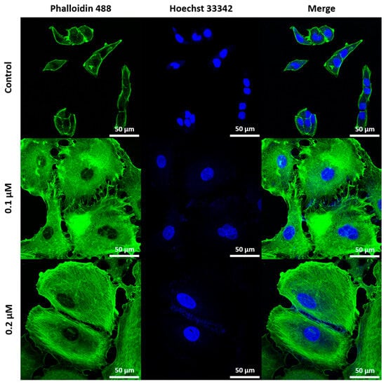 Morphological features of senescent A549 cells. Representative fluorescent images showing the morphology of senescent A549 cells in comparison to untreated control cells. Actin filaments were stained with phalloidin-488 (green), and cell nuclei were counterstained with Hoechst 33342 (blue). The final panel presents a merged view of both channels.