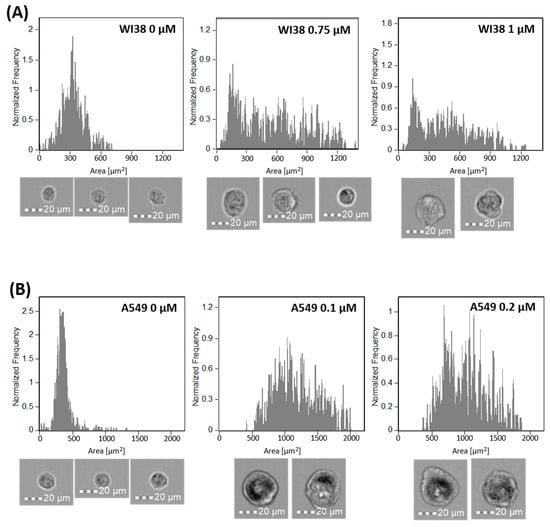 Histograms showing size differences between senescent and untreated (A) WI38 and (B) A549 cells, measured by imaging flow cytometry. Representative brightfield images of analyzed cells are shown below the corresponding histograms.
