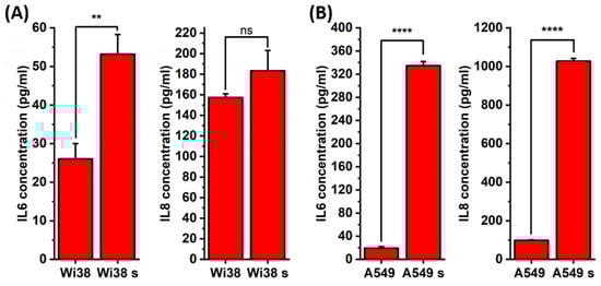 sasp analysis of IL-6 and IL-8 secretion in (A) WI38 and (B) A549 cells before and after senescence induction. s—senescent, ns—p > 0.05, **—p ≤ 0.01, and ****—p ≤ 0.0001.