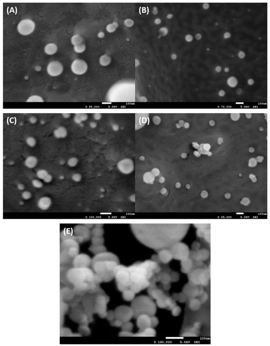 Cryo-SEM images of liposomal formulations. (A,B) Liposomes without fisetin, (C,D) liposomes with fisetin encapsulated within their structure, and (E) chain-like structures formed by fisetin-encapsulated liposomes. Scale bar = 100 nm. Full size images are in Figures S4–S8.