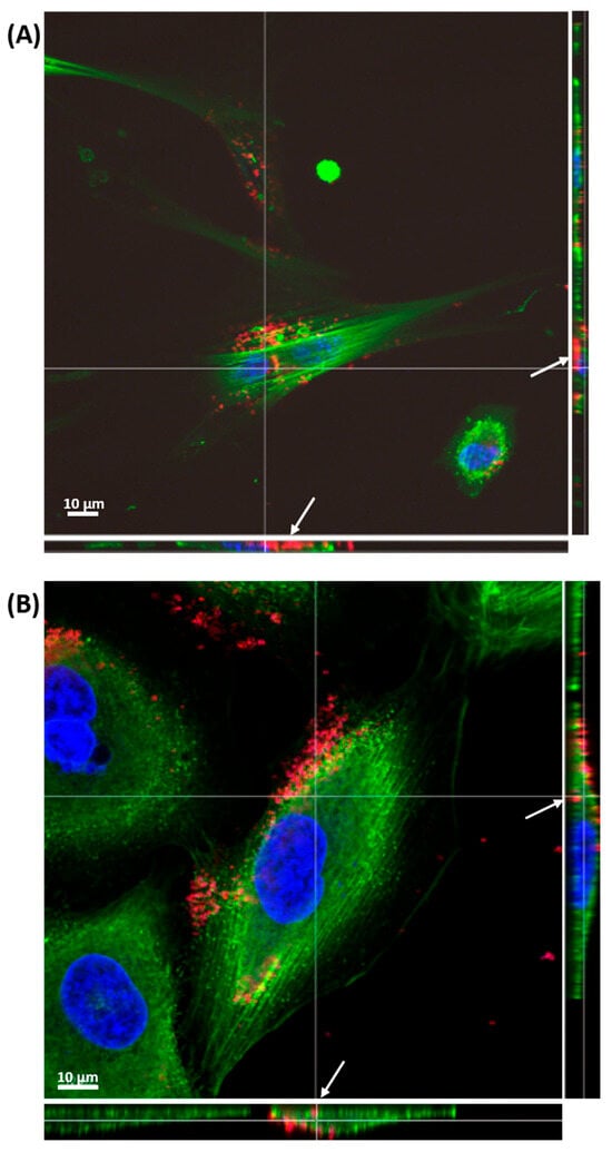 Cellular uptake of Nile red-labeled liposomes. Confocal 3D image showing (A) WI38 and (B) A549 cells stained with phalloidin-488 (green) to visualize actin filaments and Hoechst 33342 (blue) to label nuclei. Liposomes loaded with Nile red (red). White arrows indicate liposomes internalized by the cell. Scale bar: 10 μm.
