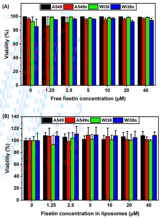 Cell viability following senotherapy. (A) Viability of cells after treatment with free fisetin, and (B) viability after treatment with fisetin encapsulated in liposomes. s—senescent.