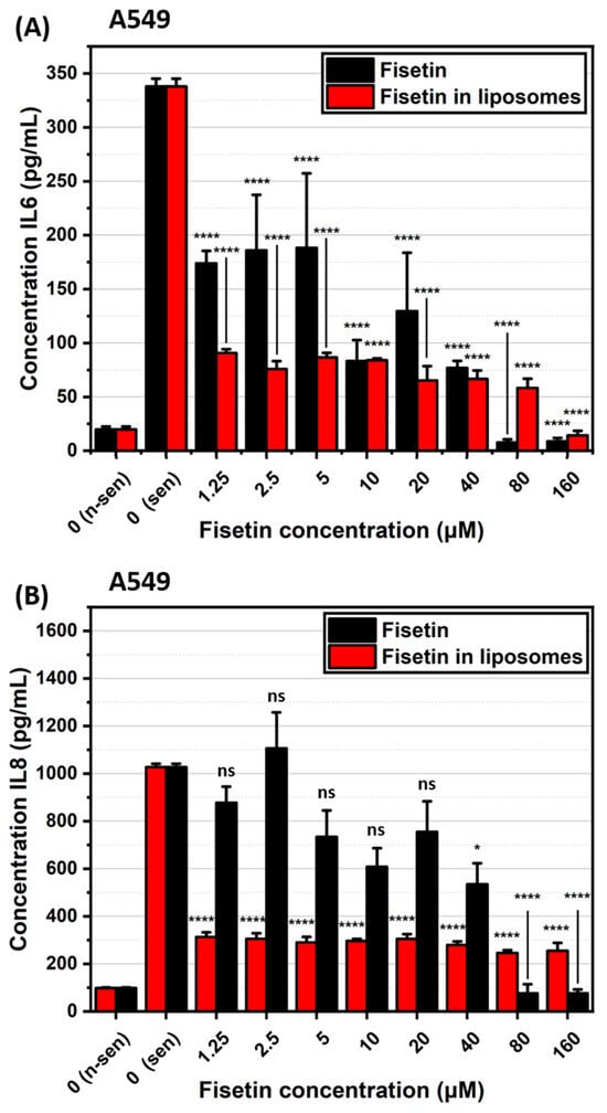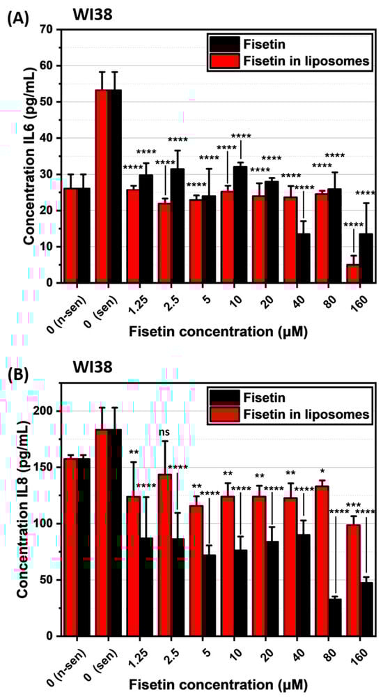 We examined the impact of fisetin on senescent A549 and WI38 cells, both in its free form and encapsulated in liposomes. Although fisetin did not exhibit senescence-specific cytotoxicity [,], we observed a significant reduction in IL-6 and IL-8 levels for both cell lines compared to senescent cells that were not treated with fisetin. In case of fisetin encapsulated in liposomes, the concentration of IL-6 and IL-8 were at similar, low levels across all tested concentrations, even at the lowest dose when compared to untreated senescent cells. This presents the power of liposomes as a drug delivery system, as it improved the efficiency of the drug in our in vitro studies.