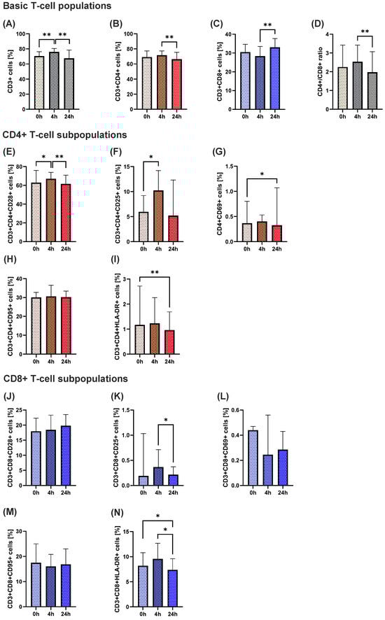 Comparison of percentage of CD3+ cells (A), CD3+CD4+ cells (B), CD3+CD8+ cells (C), CD4+/CD8+ ratio (D), CD3+CD4+CD28+ cells (E), CD3+CD4+CD25+ cells (F), CD3+CD4+CD69+ cells (G), CD3+CD4+CD95+ cells (H) CD3+CD4+HLA-DR cells (I), CD3+CD8+CD28+ cells (J), CD3+CD8+CD69+ cells (K), CD3+CD8+CD69+ cells (L), CD3+CD8+CD95+ cells (M), and CD3+CD8+HLA-DR+ cells (N) in TRD patients before 0 h, 4 h and 24 h after iv ketamine administration. The column bar graphs show the median value with confidence interval (CI). Wilcoxon test; * p < 0.05, ** p < 0.01.