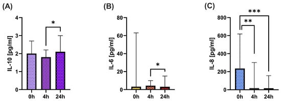 Comparison of serum concentration of IL-10 (A), IL-6 (B), and IL-8 (C) in TRD patients before 0 h, 4 h and 24 h after iv ketamine administration. The column bar graphs show the median value with CI. Wilcoxon test; * p < 0.05, ** p < 0.01, *** p < 0.001.