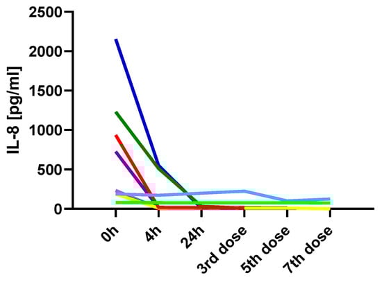 Encouraged by the evident differences in serum IL-8 levels observed at 4 and 24 h after the first ketamine administration, we aimed to investigate whether this trend would remain over the following weeks of the study. Due to organizational constraints, we were able to collect blood samples at later stages of the study from only a limited number of participants. Blood samples were collected 24 h after the 3rd, 5th, and 7th (odd-numbered) ketamine infusions, at weekly intervals. Although the limited sample size precluded a reliable statistical analysis, reduced IL-8 levels persisted during the following weeks of treatment (Figure 3).