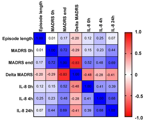 Heat map illustrating Spearman’s rank-order correlation (r) between episode length, MADRS scores at baseline and study endpoint, and IL-8 concentrations at various time points following ketamine administration. The color gradient reflects the strength and direction of correlations, with warm colors indicating positive correlations and cool colors representing negative correlations. The given r values are significant.