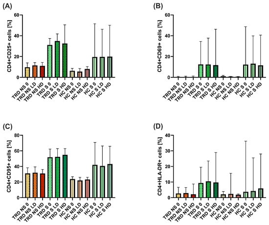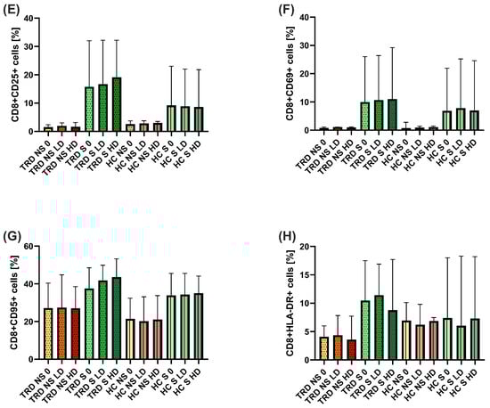 Comparison of the percentage of proliferating CD4+CD25+ cells (A), CD4+CD69+ cells (B), CD4+CD95+ cells (C), CD4+HLA-DR+ cells (D), as well as CD8+CD25+ cells (E), CD8+CD69+ cells (F), CD8+CD95+ cells (G), and CD8+HLA-DR+ cells (H). Cells of healthy individuals (HC) and TRD patients were stimulated with anti-CD3 (S) in the presence of 185 ng/mL (low doses—LD) or 350 ng/mL (HD—high dose) ketamine or without it (0) for 72 h. Non-stimulated (NS) cells were also incubated with different doses of ketamine. The column bar graphs show the median value with CI.