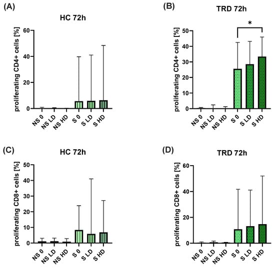 Comparison of the percentage of proliferating CD4+ and CD8+ cells from healthy controls (A,C) and TRD patients (B,D). TRD—patients, HC—healthy control, NS—non-stimulated, S—stimulated, 0—without ketamine, LD—low dose of ketamine, HD—high dose of ketamine. The column bar graphs show the median value with CI. ANOVA Friedman with Dunn’s multiple comparisons test, * p < 0.05.