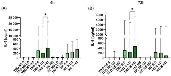 Supernatant concentrations of IL-8 (A) and IL-6 (B) after incubation with ketamine. TRD-patients, HC—healthy control, NS—non-stimulated, S—stimulated, 0—without ketamine, LD—low dose of ketamine, HD—high dose of ketamine. The column bar graphs show the median value with CI. ANOVA Friedman with Dunn’s multiple comparisons test, * p < 0.05.