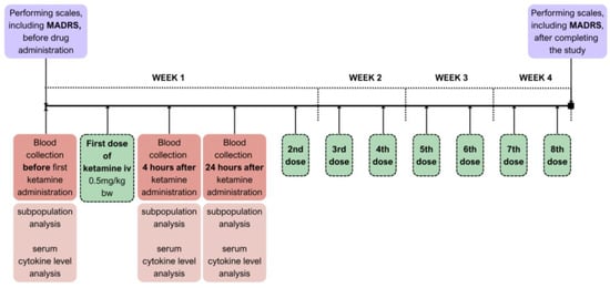 The study followed an observational design; all patients continued their baseline psychotropic treatment (Figure 8). The therapeutic intervention included intravenous ketamine infusion, administered at a dose of 0.5 mg/kg based on the actual body weight of the patient and given over 40 min. The preparation used for infusions was Ketalar 50 (ketamine hydrochloride) 50 mg/mL; one vial contained 10 mL. The managing psychiatrist monitored safety before, during, and after the infusion every 15 min to 1.5 h, including periodic assessment of vital signs (heart rate, body temperature, respiration rate, blood pressure, and oxygen saturation). Safety monitoring also included the Brief Psychiatric Rating Scale (BPRS) and Clinician-Administered Dissociative States Scale (CADSS) at baseline and one hour after the infusion.