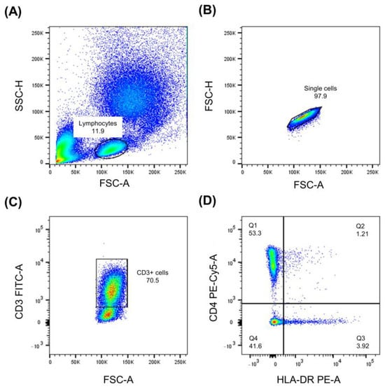Twenty thousand events corresponding to light scatter characteristics of viable lymphocytes were acquired from each sample to analyze lymphocyte subpopulations. First, lymphocytes were selected based on forward and side scatter characteristics (Figure 9A); only single cells were included in the analysis (Figure 9B). Then, T cells were identified based on their positivity for the CD3 antigen (Figure 9C). Next, helper T cells were recognized based on the expression of CD4 antigen, and cytotoxic T cells based on CD4 and CD8 expression. Finally, subpopulations expressing different activation antigens, e.g., CD25 antigen, were identified (Figure 9D). The cytometric data were analyzed using the FlowJo version 10 software (Beckton Dickinson, Franklin Lakes, NJ, USA).