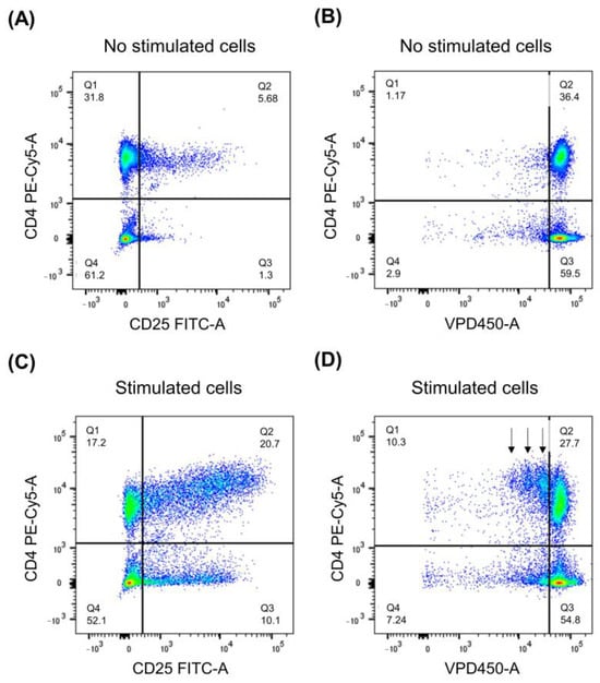 Analysis of phenotype and proliferation of lymphocytes in vitro. Non-stimulated (A,B) and stimulated (C,D) lymphocytes were identified based on the expression of CD4 antigen. Expression of activation antigens, e.g., CD25, was analyzed (A,C). VPD450 dye was used to analyze proliferating cells (B,D), which are marked with arrows (D). The figures are presented as density plots that show cell distribution with areas of high cell concentration appearing as denser, red colored.