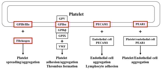 Transmembrane receptors on the platelet surface mediate platelet adhesion (glycoprotein [GP]Ib-IX-V complex), aggregation (integrin αIIbβ3), inflammatory responses, and immune regulation (e.g., GPVI and C-type lectin-like receptor 2 [CLEC-2]) []. In this study, we selected five genes (ITGB3, FGG, GP1BA, PECAM1, and PEAR1) related to platelet activation for analysis (Figure 1). The ITGB3 gene encodes integrin subunit beta 3 (GPIIIa, CD61), which is a component of the platelet receptor αIIbβ3 complex. This complex binds fibrinogen and von Willebrand factor to mediate platelet aggregation. The FGG gene encodes the gamma chain of fibrinogen. Fibrinogen is converted to fibrin to form a blood clot, or it binds to the αIIbβ3 complex on the platelet surface to activate platelets. The GP1BA gene encodes glycoprotein Ib alpha chain (GPIB, CD42b), which is a component of the GPIb-IX-V complex on the platelet surface. The GPIb-IX-V complex binds von Willebrand factor to mediate platelet adhesion []. The PECAM1 gene is expressed in vascular endothelial cells and platelets; its protein product (platelet endothelial cell adhesion molecule 1) regulates platelet–vessel wall interactions, vascular permeability, and inflammatory inhibition []. Finally, the PEAR1 gene encodes platelet endothelial aggregation receptor 1, which is a platelet membrane protein that is essential for platelet activation and aggregation [].