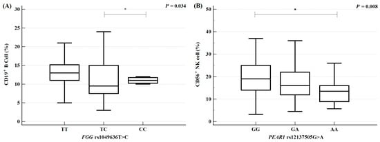 Association between differences in white blood cell levels; the proportions of CD19+ B and CD56+ NK cells; and the FGG rs1049636 T > C and PEAR1 rs12137505 G > A polymorphisms in patients with recurrent pregnancy loss (RPL). (A) Association between CD19+ B cell proportions and the FGG rs1049636 T > C polymorphism. (B) Association between CD56+ NK cell proportions and the PEAR1 rs12137505 G > A in patients with RPL.