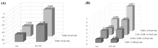 Synergic effect analysis for the interplay between TSH level and ITGB3 rs3809865 A > T gene polymorphism in RPL prevalence. (A) Categorized TSH levels into two groups: < 2.5 μU/mL and ≥ 2.5 μU/mL. (B) Divided TSH levels into quartiles.