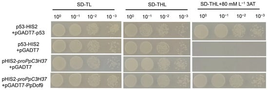 The results of the yeast single-hybridization experiment indicated that PpDof9 interacted with the promoter of PpC3H37 (Figure 1). The p53-HIS2 + pGADT7-p53 was used as a positive control and could grow normally on the SD/-trp/-leu/-his medium containing 80 mM 3-amino-1,2,4-triazole. Conversely, the negative control pHIS2-promoter of PpC3H37 plus pGADT7 and p53-HIS2 plus pGADT7 proved that the operation of this experiment was correct. The pGADT7-PpDof recombinant plasmid was co-transformed into yeast with the PpC3H37 promoter, namely pHIS2-promoter of PpC3H37. The results showed that they could grow normally on SD/-trp/-leu/-his containing 80 mM 3AT, indicating that PpDof9 could activate the expression of the reporter gene, enabling pHIS2-promoter of PpC3H37 to grow normally on the three-deficient plate containing 3AT.