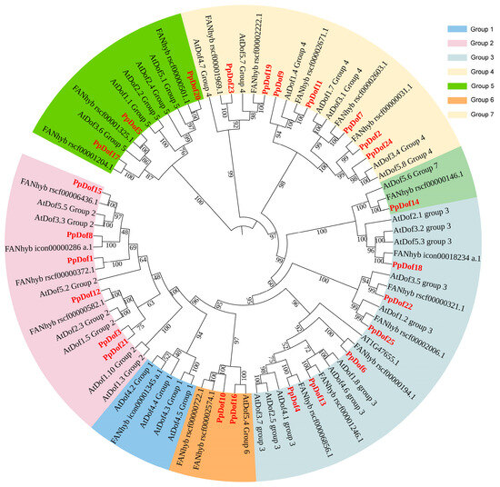 In order to further elucidate the quantity of PpDof TFs in peaches, we performed a comprehensive identification of the PpDof gene family members and conducted subsequent bioinformatic analyses. The results revealed that the peach genome harbors 25 PpDof genes. To gain deeper insights into the evolutionary relationships of the peach Dof gene family, this study integrated peach Dof protein sequences with previously obtained Arabidopsis thaliana and strawberry Dof protein sequences. Using IQ-TREE (2.1.4-beta) software, we constructed a maximum likelihood (ML) tree, with the results shown in Figure 2. Following the subfamily classification criteria established for Arabidopsis thaliana Dof genes, the 25 peach Dof genes were categorized into subfamilies. The analysis revealed that these genes could be classified into six subfamilies (Groups 2–7). Notably, no corresponding peach Dof members were found in group 1 of Arabidopsis thaliana, where only a single strawberry Dof gene was present. This suggests that the peach may have undergone the loss of group 1 gene members during its evolutionary history. Regarding the distribution of peach Dof genes across subfamilies, group 2 and group 3 each contained six peach Dof members, group 4 contained seven, group 5 contained three, group 6 contained two, and group 7 had only one. The distribution pattern of members across subfamilies in the strawberry (also belonging to Rosaceae) was largely consistent with that of the peach. With the exception of group 1, each strawberry Dof gene clustered closely with its corresponding peach Dof counterpart in the phylogenetic tree, indicating a closer evolutionary relationship between peach and strawberry Dof genes.