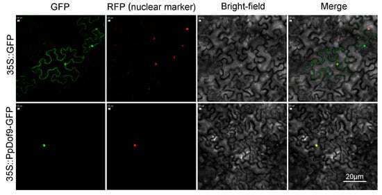 Subcellular localization of PpDof9. GFP: green fluorescent protein. RFP (nuclear marker): red fluorescent protein. Scale bar: 20 μm.