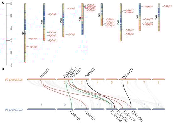 PpDof chromosome localization (A) and a collinearity analysis (B).