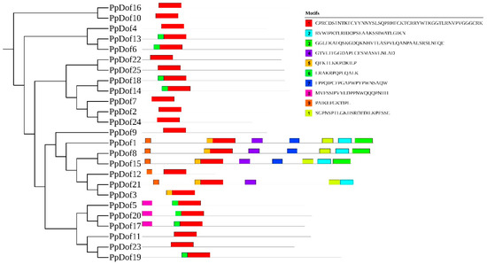 Within the phylogenetic relationships of various families, most closely related genes consist of similar conserved motifs, indicating functional similarity among the PpDof family. As shown in Figure 5, motif 1 is present in all proteins and represents a highly conserved motif among PpDof genes.