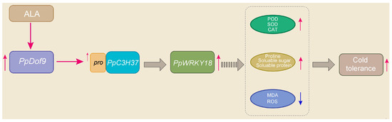 The possible regulatory pathway of PpDof9 involvement in ALA-enhanced cold tolerance in peach flowers. Note: → represents a positive effect. The red arrow represents positive regulation and the blue arrow represents negative regulation.