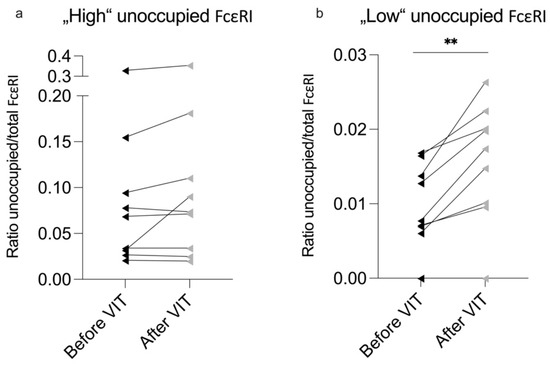 Comparison of ‘High’ and ‘Low’ unoccupied FcεRI groups. The ratio of total-to-unoccupied FcεRI in the (a) ‘High’ (over 2%) and (b) ‘Low’ (under 2%) unoccupied FcεRI groups. VIT—venom immunotherapy. Significant difference before and after VIT is indicated as ** (p-value < 0.01).