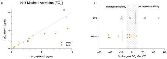 Changes in half-maximal activation (EC50) for BATs before/after VIT induction in bee- and wasp-allergic patients. (a) Absolute change in EC50 for BATs; (b) relative change in EC50 for BATs. Orange and black dotted line represent the mean. Gray dotted area represents ±10%.