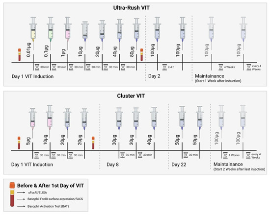 Ultra-rush and cluster VIT induction protocols with the corresponding maintenance doses. SCIT—subcutaneous specific immunotherapy. Created using https://BioRender.com. In this study, blood was drawn from the patient according to this protocol.