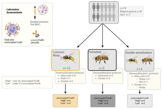 - Čelesnik, N.; Vesel, T.; Rijavec, M.; Šilar, M.; Eržen, R.; Košnik, M.; Žitnik, S.E.K.; Avčin, T.; Korošec, P. Short-term venom immunotherapy induces desensitization of FcεRI-mediated basophil response. Allergy 2012, 67, 1594–1600. [Google Scholar] [CrossRef]