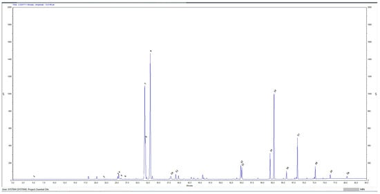 The chromatographic profile of R. damascena Mill essential oil, plotted with retention time (minutes) on the x-axis and picoampere (pA) on the y-axis, showed a series of peaks representing volatile constituents. The peaks’ position on the x-axis indicates the time it took for each compound to elute from the column, while the peak height on the y-axis reflects the concentration of that compound. Data was processed using Agilent chromatography data systems (CDSs) software—OpenLab CDS—Agilent RapidControl.NET. The identification of compounds was performed by comparing retention times and authentic references in a chromatographic system. The quantification of the main compounds was achieved by measuring the peak area, without applying any correction factors. Results were presented as relative percentages in Table 1.