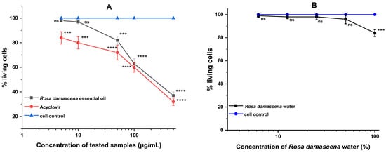 Cytotoxicity of rose products against RRCs. (A) Cytotoxicity of R. damascena Mill essential oil; (B) Cytotoxicity of R. damascena Mill floral water. The statistical analysis included a one-way ANOVA analysis of variance followed by Dunnett’s post hoc test. The comparison was made to the result of comparison with the viral control: ns—no significant, *** p < 0.001, **** p < 0.0001. Number of replicates performed for a sample, n = 3.