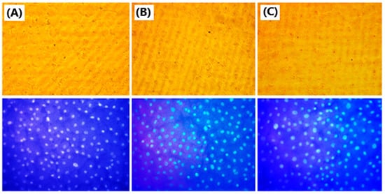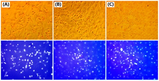 Morphology of a cell monolayer of RRCs: (A) control (untreated cells), (B) treated with 50% rose water, and (C) treated with 10 μg/mL rose oil. Light (yellow color) and fluorescence (blue color) microscopy. Objective 20×.