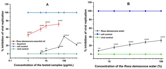 Antiviral activity of rose products against HSV-1. (A) Antiviral activity of R. damascena Mill essential oil. (B) Antiviral activity of R. damascena Mill floral water. The statistical analysis included a one-way ANOVA analysis of variance followed by Dunnett’s post hoc test. The comparison was made to the result of comparison with the viral control: ns—no significant, ** p < 0.01, *** p < 0.001, **** p < 0.0001. Number of replicates performed for a sample, n = 3.