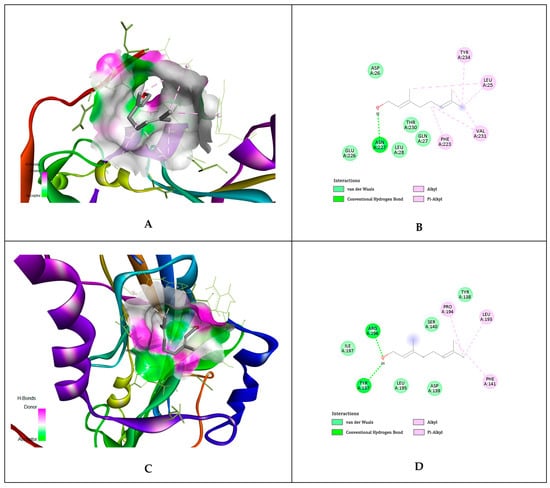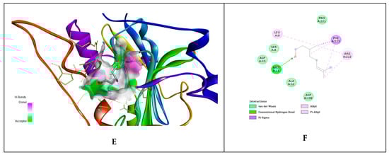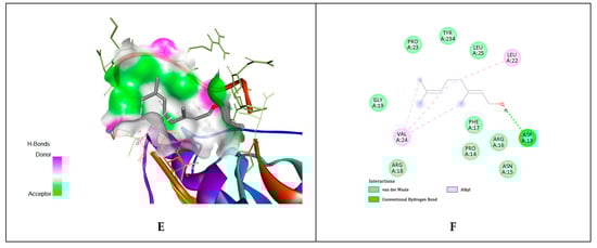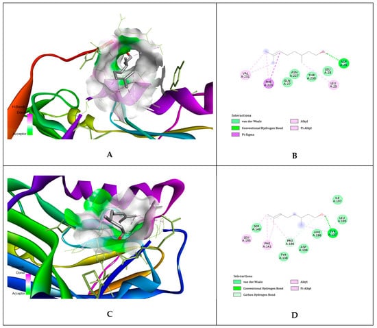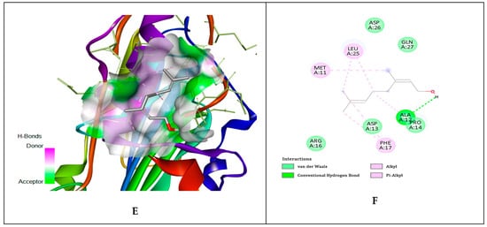 Citronellol interactions with gD HSV-1 at nectin-1 and HVEM biding sites. (A,B)—citronellol interaction with gD binding surface of nectin-1 at N-terminal extention; (C,D)—citronellol interaction with gD binding surface of nectin-1 at C-terminal extention; (E,F)—citronellol interaction with gD binding surface of HVEM host cell receptor, at N-terminal extension.