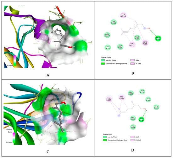 Analysis of each binding pose was conducted for binding score and presence of molecular interactions between geraniol, citronellol, and nerol targeting gD HSV-1 at N-, C-terminal extensions, and at N-terminal extension at binding site of nectin-1 and HVEM host cell receptors, respectively. The ligands (i.e., geraniol, citronellol, and nerol) were subjected to molecular docking with all target regions of gD molecule using AutoDock Vina (v. 4.2.6). The dock preparation function of MGLTools (v 1.5.7) was utilized to prepare each protein for docking that included hydrogens and Gasteiger charges. Forcefield calculations were applied to analyze the ligand for hydrogen atoms, applicable charges, and rotatable bonds. The grid area for gD area of interactions with host cells receptors nectin-1 and HVEM was defined for the targeting ligands. The simulation of docking was conducted with Genetic Algorithm by binding energy minimization and evaluation with RMSD cluster analysis using the ligand atoms only. The number of conformations was fixed at 10. The results generated 10 binding poses of the ligands studied for the designed target gD. The top-ranked poses of each ligand with low binding energies were found to be within the three definite binding sites of both receptors (nectin-1 and HVEM). We have chosen the lowest energy of binding complexes from 10 conformation possibilities of docking with gD HSV-1 for each ligand. The main interactions were hydrophobic and through hydrogen bonding. The studied compounds of rose oil, which are terpene alcohols, indicate that only the hydroxyl groups are indispensable for hindering viral adsorption to the host cell receptors nectin-1 and HVEM. The lowest binding energies of geraniol for all specifics interaction surfaces of gD HSV-1, with the three main rose oil compounds (ligands) are shown in Table 7. The interactions for the geraniol, citronellol, and nerol targeting the gD HSV-1 at nectin-1 and HVEM cellular receptors are presented in Figure 6, Figure 7, and Figure 8, respectively.
