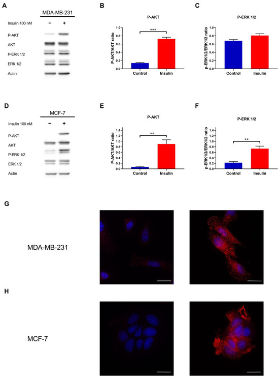 AKT phosphorylation was corroborated by immunofluorescence, with insulin-increasing cytoplasmic and membrane staining in MDA-MB-231 (Figure 1G) and MCF-7 (Figure 1H) cell lines.