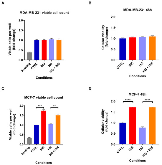 In light of the well-recognised mitogenic effect of insulin [30,34] and the increased glucose consumption by cancer cells [35], it was investigated whether high insulin level or high-glucose containing medium alone, or in combination, were able to promote the proliferation of both MDA-MB-231 and MCF-7 cell lines. A 48 h treatment with 25 nM insulin alone did not enhance the proliferation of MDA-MB-231 cells (p > 0.999) (Figure 2A), whereas it induced MCF-7 cell growth by 40% (p < 0.001) (Figure 2C), as also confirmed by MTT assays (p = 0.658 and p < 0.001, respectively) (Figure 2B,D). Instead, 48 h treatment with high-glucose containing medium did not increase cell proliferation in either cell line (p = 0.917 and p = 0.706, for MDA-MB-231 and MCF-7 viable cell count, respectively) (Figure 2A,C) as also confirmed by MTT assays (p = 0.476 for MDA-MB-231 and p = 0.001 for MCF-7) (Figure 2B,D). In addition, high-glucose containing medium did not enhance the pro-proliferative effect of insulin in MCF-7 cells as shown by viable cell count (p > 0.999), although the MTT assay revealed a reduction in metabolic activity in cells exposed to high glucose levels (p = 0.034). This result may reflect an alteration in mitochondrial function induced by high glucose levels, rather than a decrease in cell viability (Figure 2C,D).